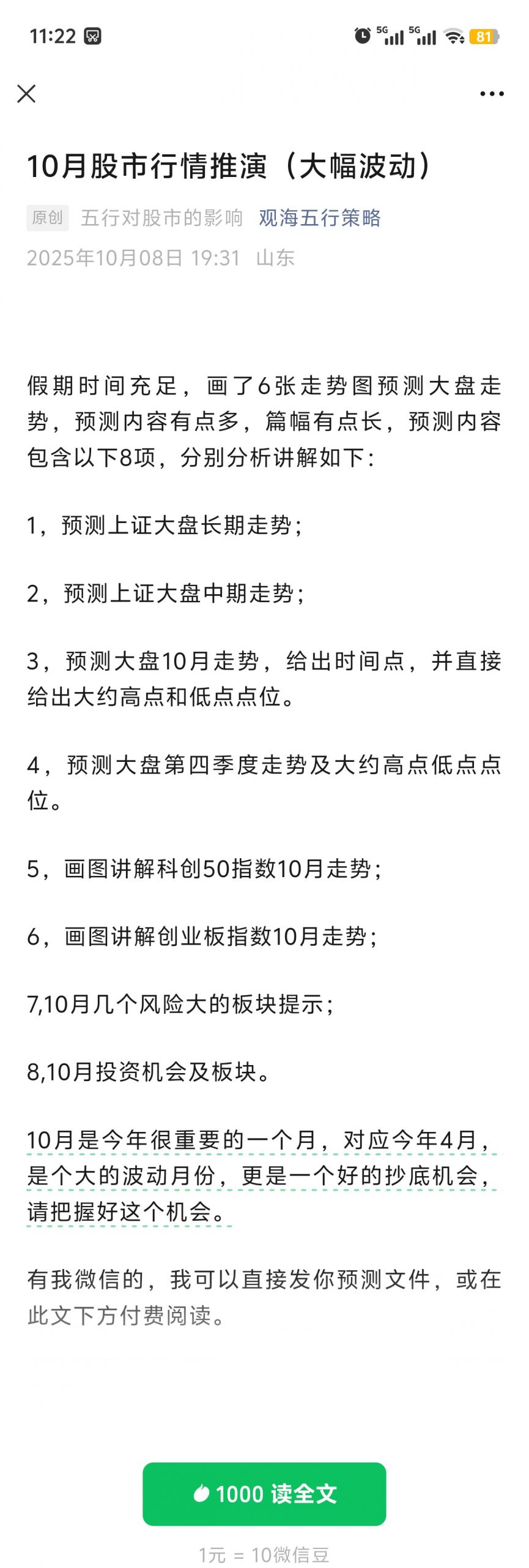 本文于 2025-10-10 11:38 更新,部分内容具有时效性,如有失效,请留言 251008观海五行策略100元付费文:10月股市行情推演(大幅波动) 资源下载资源下载价格9.9元立即购买 或 升级VIP后免费升级VIP①售后QQ:32492069 ②默认解压密码“QQ28222936”