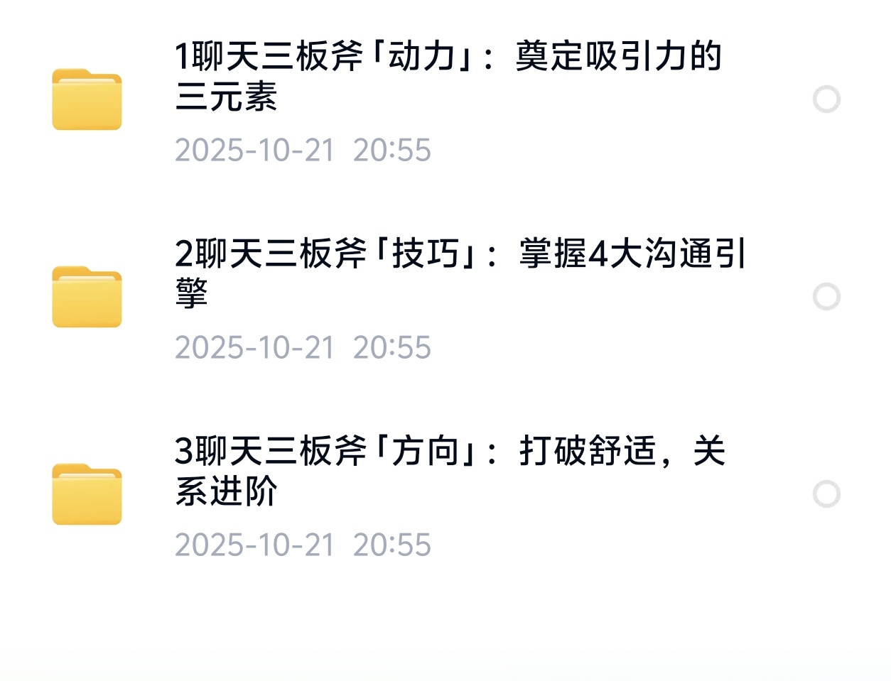 本文于 2025-10-21 21:48 更新,部分内容具有时效性,如有失效,请留言 倪聊天课《聊天三板斧》一套系统完整可复制的聊天思维与操作体系。 资源下载资源下载价格19.9元立即购买 或 升级VIP后免费升级VIP①售后QQ:32492069 ②默认解压密码“QQ28222936”