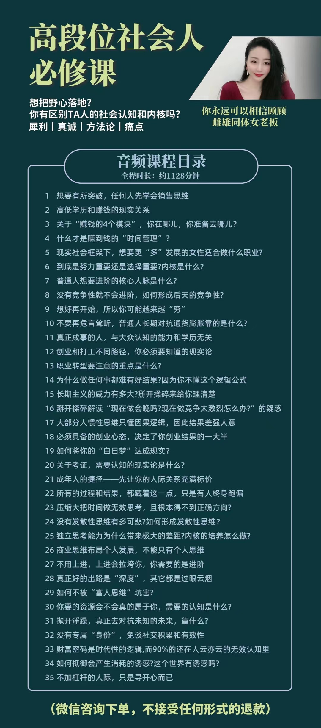 本文于 2025-11-24 16:59 更新,部分内容具有时效性,如有失效,请留言 猫总顾顾 高段位社会人必修课 想把野心落地 你有区别于他人的社会认知和内核吗 资源下载资源下载价格99元立即购买 或 升级VIP后免费升级VIP①售后QQ:32492069 ②默认解压密码“QQ28222936”