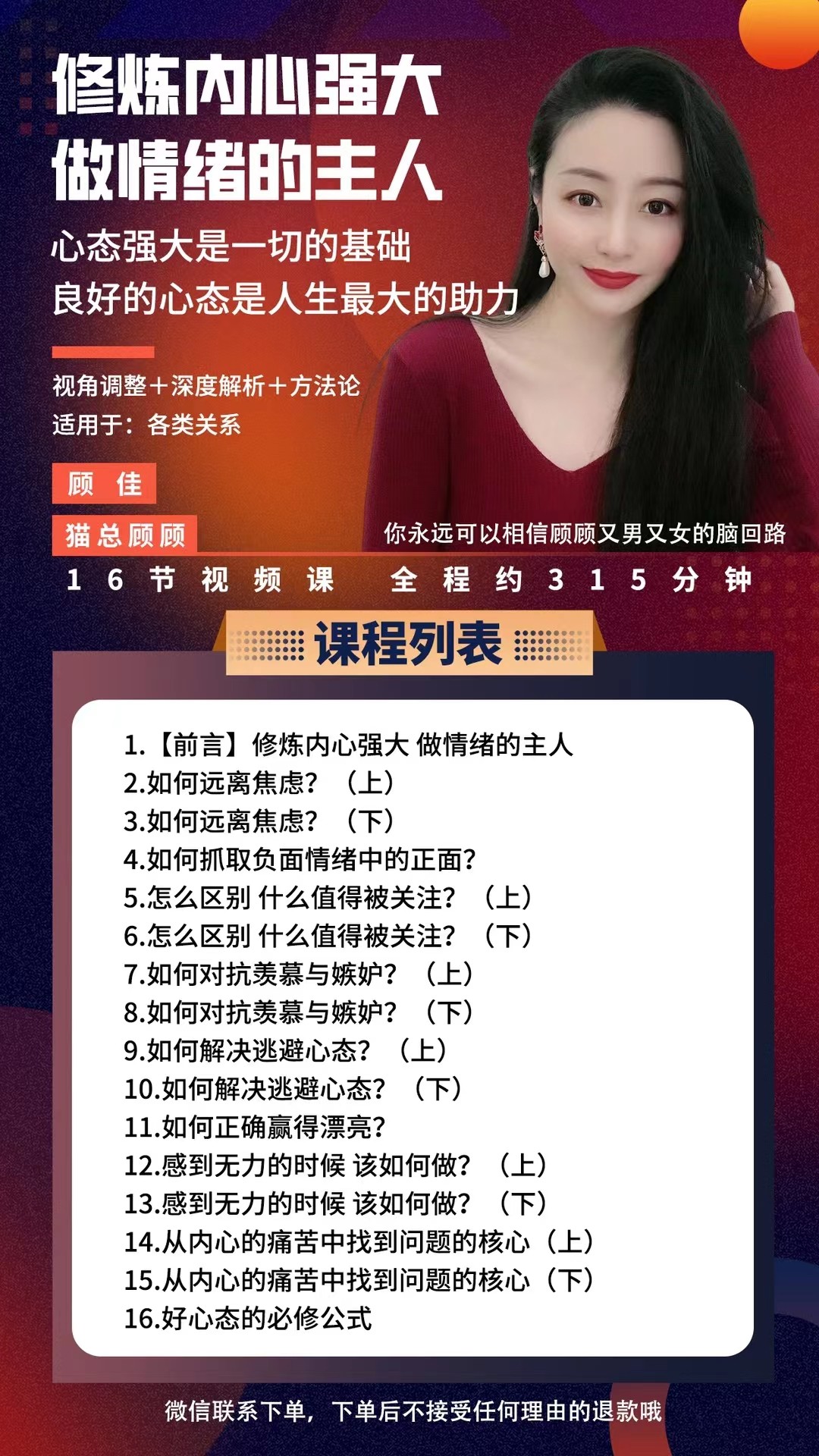 本文于 2025-11-24 16:57 更新,部分内容具有时效性,如有失效,请留言 猫总顾顾心态课《修炼内心强大,做情绪的主人》 资源下载资源下载价格69.9元立即购买 或 升级VIP后免费升级VIP①售后QQ:32492069 ②默认解压密码“QQ28222936”